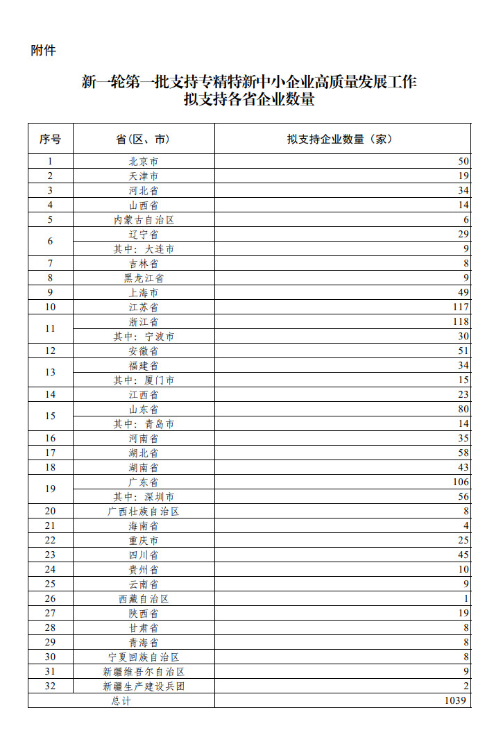为深入贯彻习近平总书记关于“培育一批专精特新中小企业”的重要指示精神,我部联合财政部开展了新一轮第一批支持专精特新中小企业高质量发展工作,已完成各省级中小企业主管部门会同财政部门择优遴选推荐、专家审核等程序,形成审核意见。现将拟支持各省企业数量向社会进行公示。