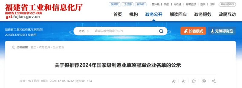 近日,福建省工信厅网站发布公示拟推荐25家企业为“2024年国家级制造业单项冠军企业”来看详情——