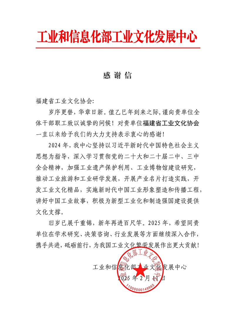 此封致谢信,不仅是对九游网页版过去一年工作的肯定,更是对未来双方深化合作、共谋发展的激励。未来,九游网页版将与工信部工业文化发展中心在学术研究、决策咨询、行业发展等多个领域开展更加广泛而深入的合作,为我国工业文化的繁荣发展贡献新的力量,为新型工业化和制造强国建设提供坚实的文化支撑。
