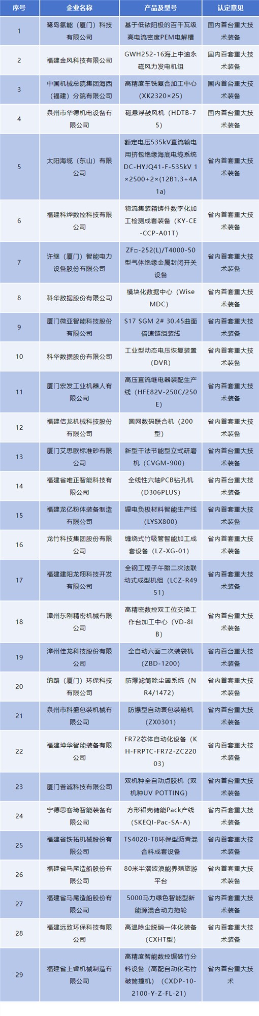 “基于低铱阳极的百千瓦级高电流密度PEM电解槽”等29个福建省首台(套)重大技术装备名单